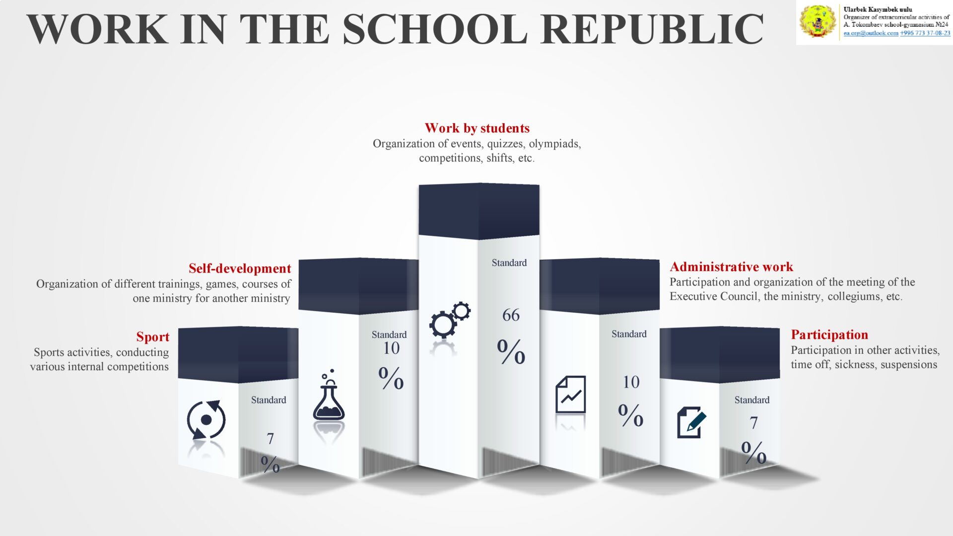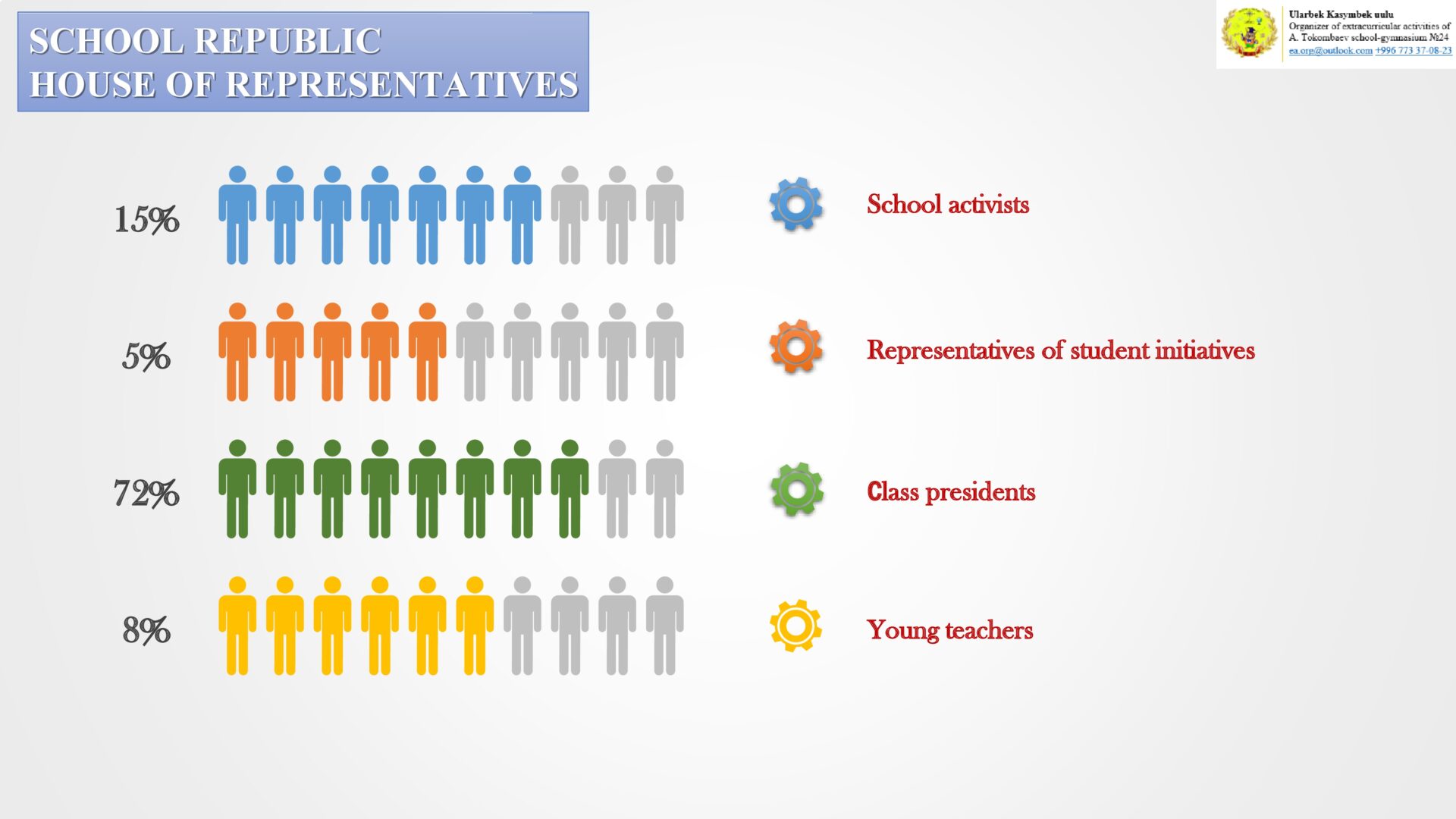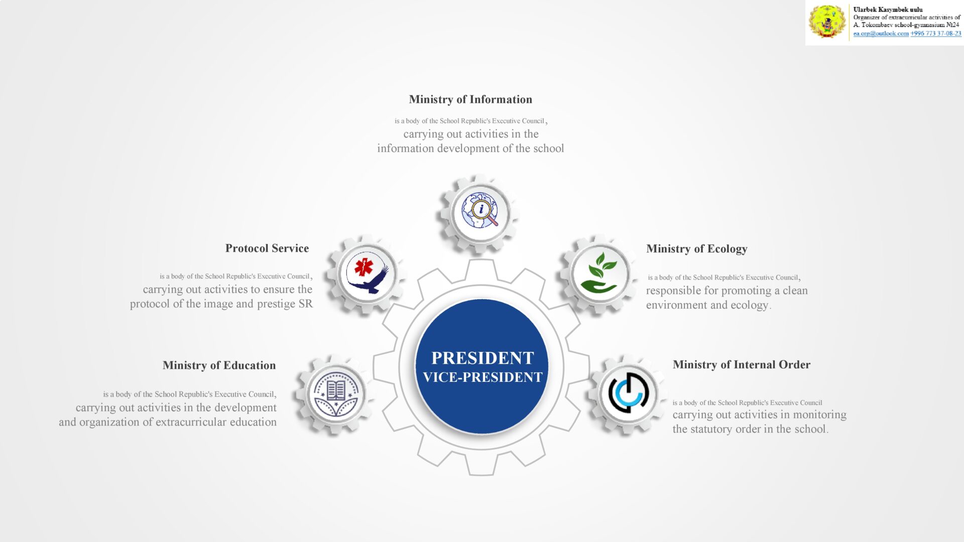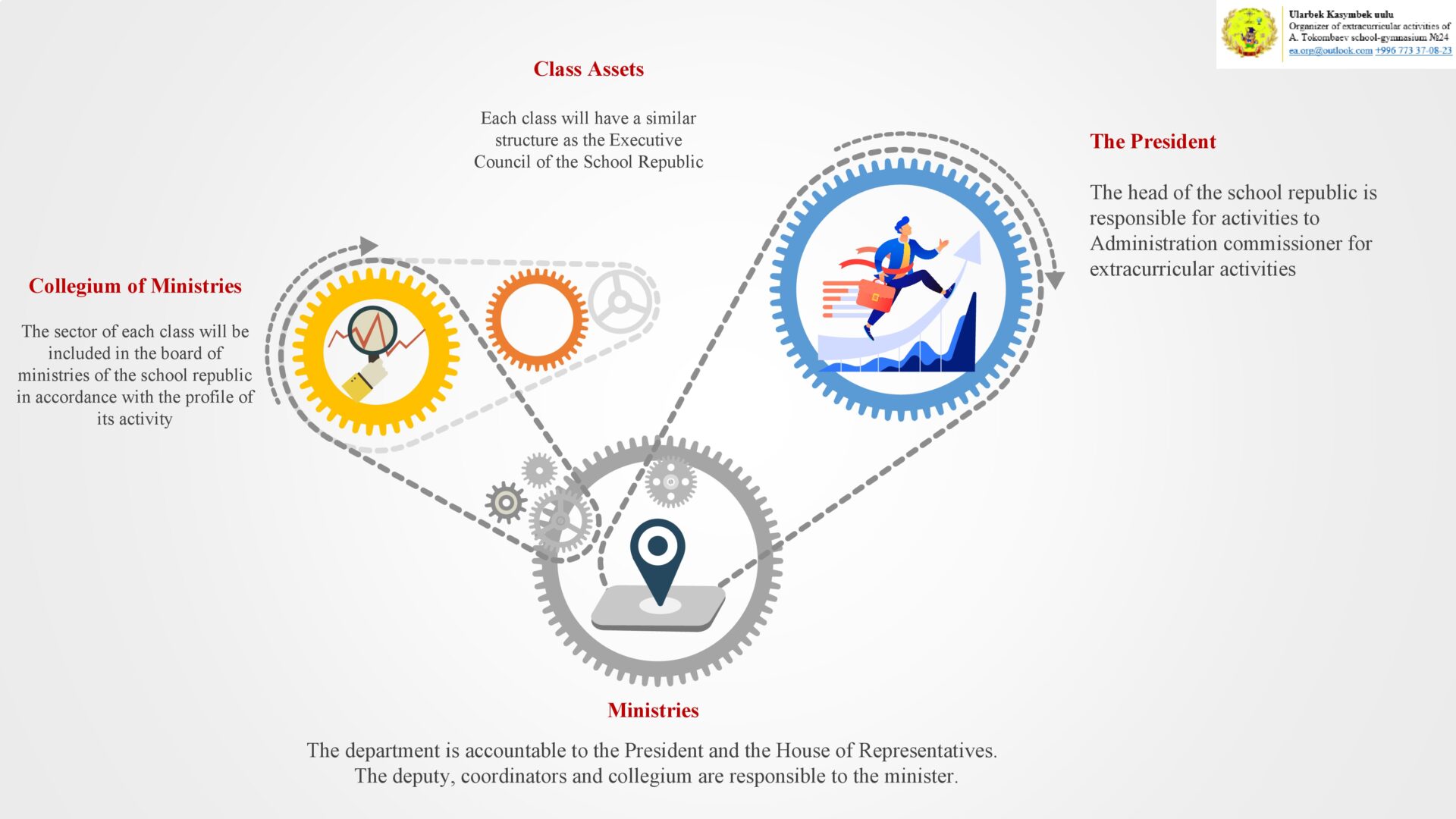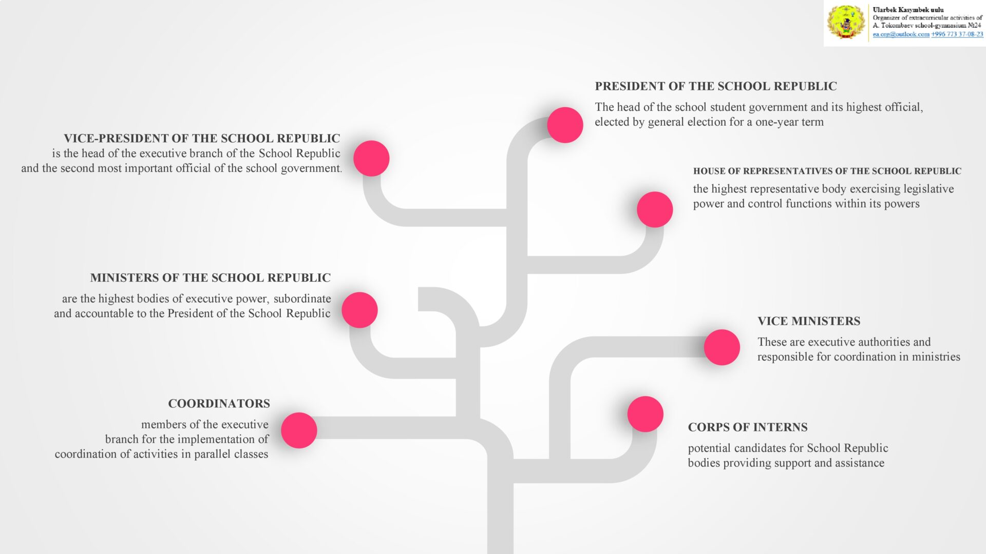 The School Republic “Achyk-Asman” is the statutory body of the school-gymnasium No. 24 named after. A. Tokombaev, which is a student self-government. By type of organization, it is a prototype of a full-fledged democratic state within the school community. The activities are based on the School Charter and are regulated by the Regulations “On School Self-Government”. The implementation of the selection of the composition and the determination of the organizational structure is carried out by the student self-government itself with the consent of the School Administration in the person of the commissioner for extracurricular activities. The School Republic has three branches of government while maintaining balance and justice: