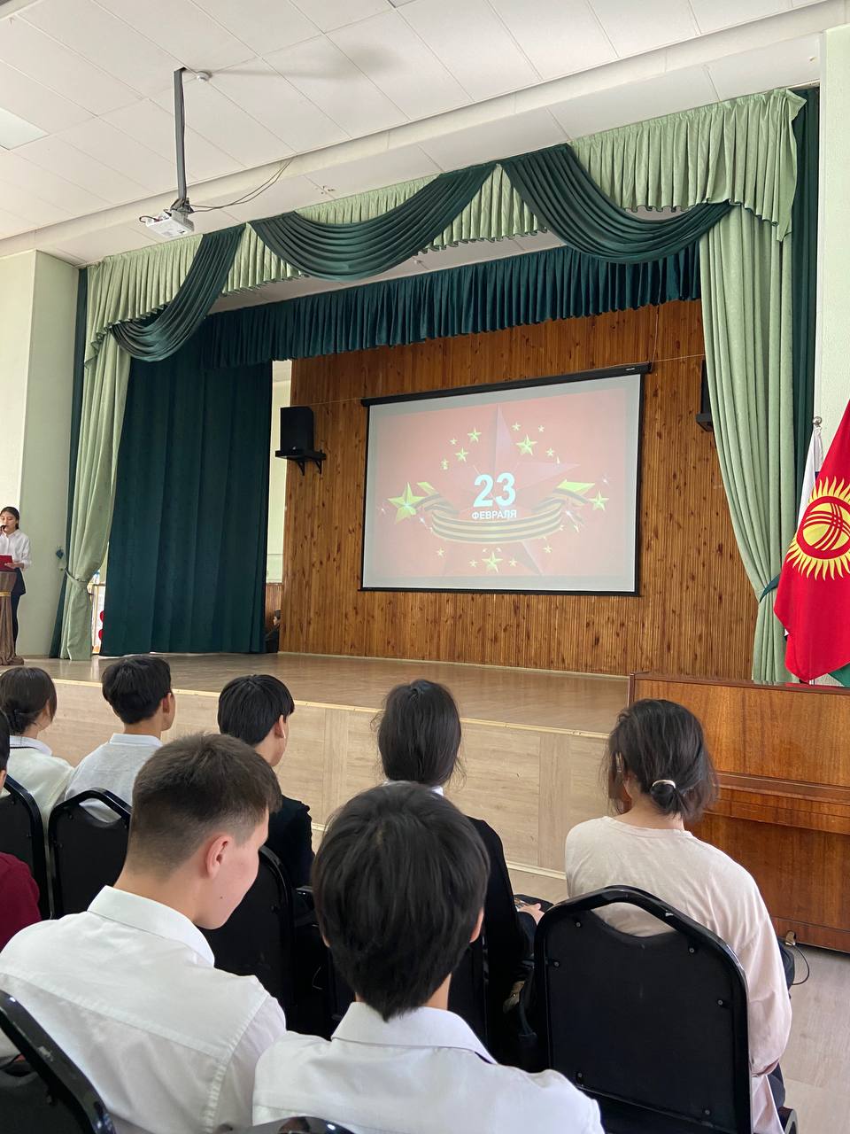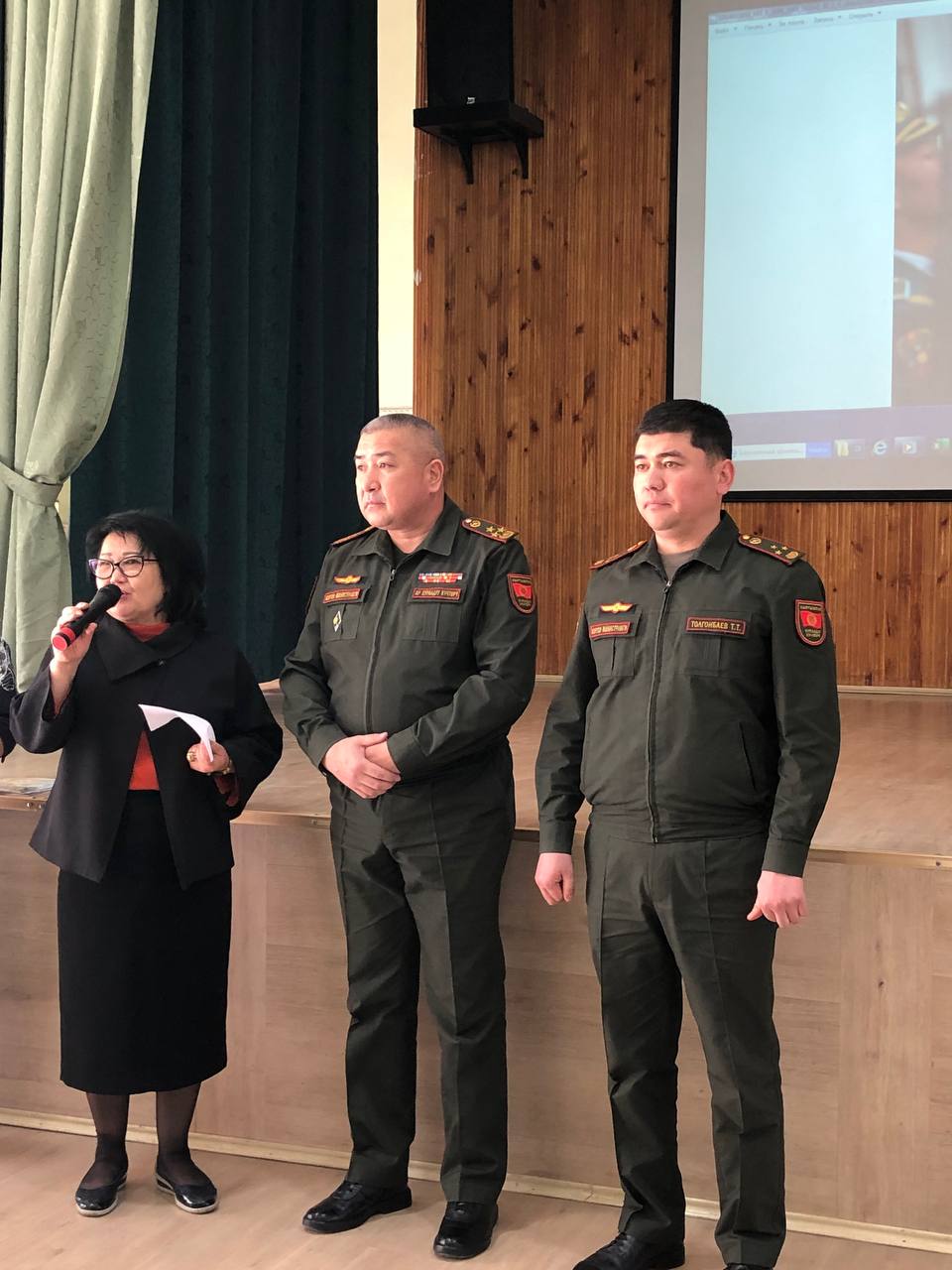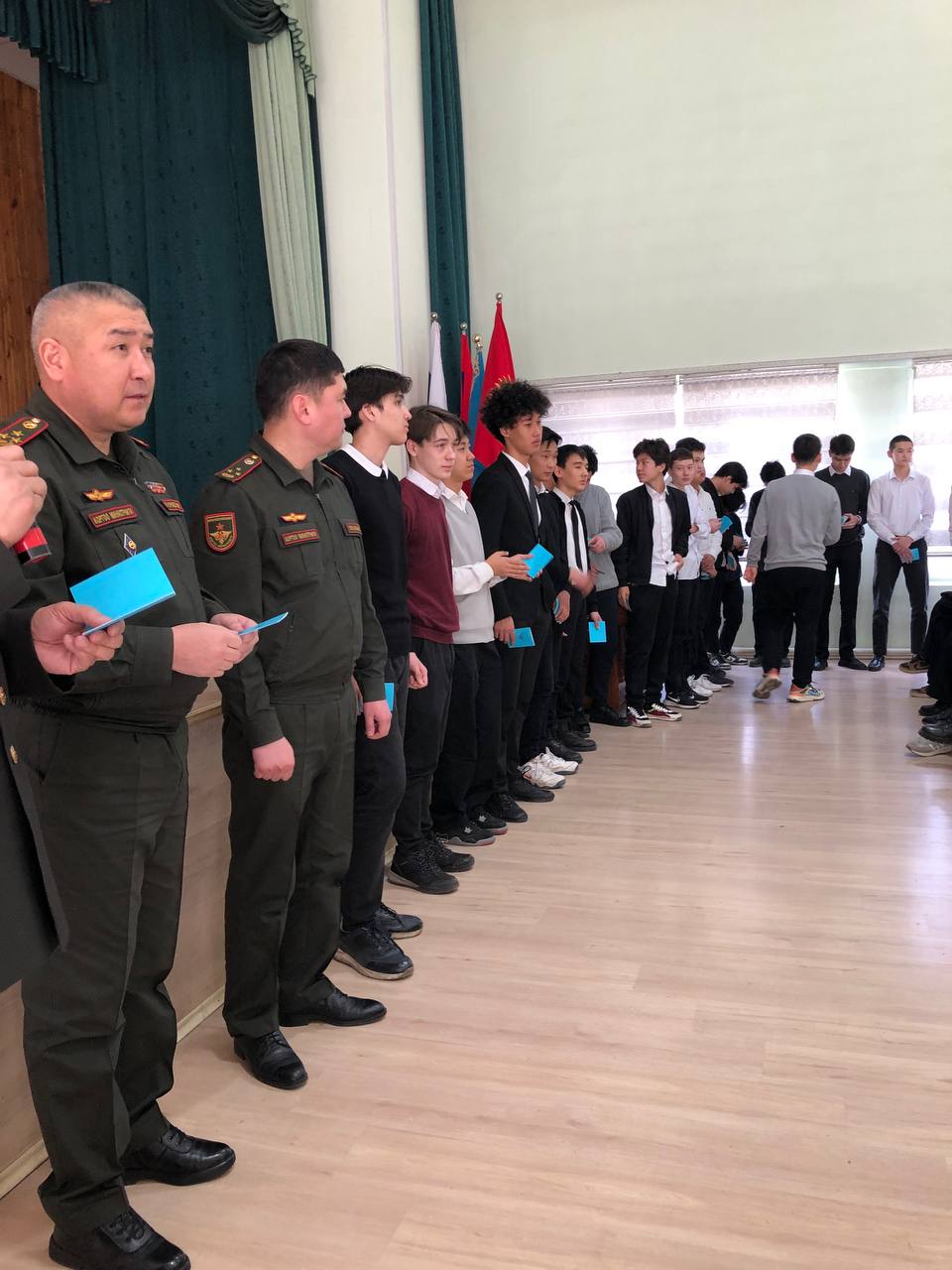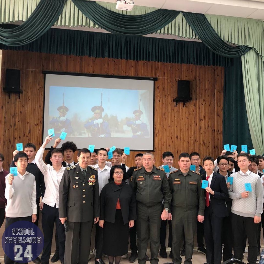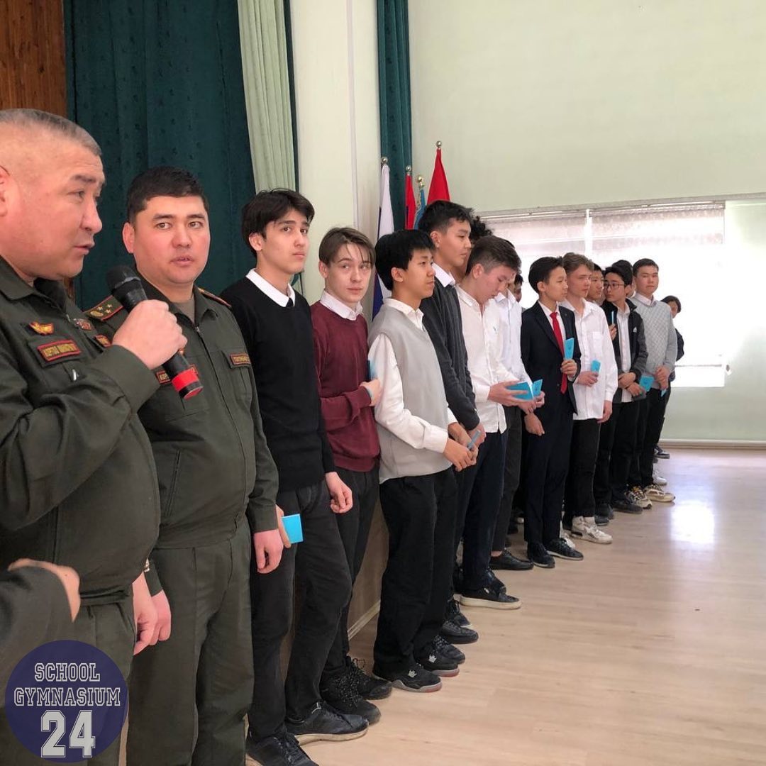 On February 22, our school celebrated Defender of the Fatherland Day. Together with the students and teachers of our school, the military commissar of the First May district of Bishkek also took part in the celebration. During the celebration, school principal Anara Khabibovna Abduraimova congratulated all the defenders of the Fatherland and wished them good health. In continuation of the official part of the event, our teacher of pre-conscription training of youth, retired colonel Marat Shailoobekovich Abdykadyrov read out the names of the future defenders of the Fatherland in the ranks of the Armed Forces: our guys from the 9th grade received a military registration certificate from the hands of the military commissar of the First May district.