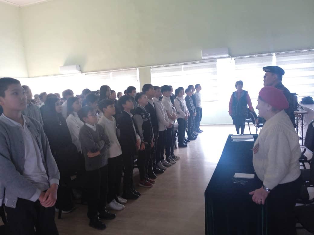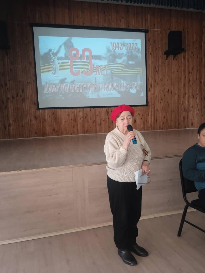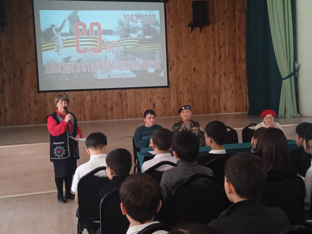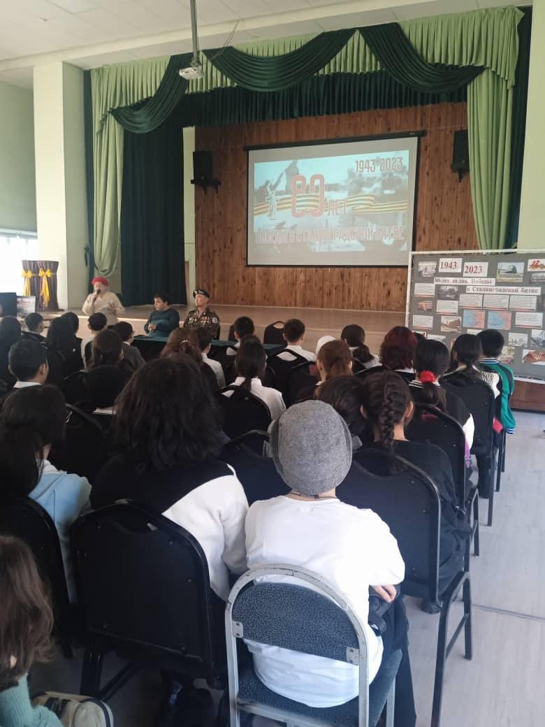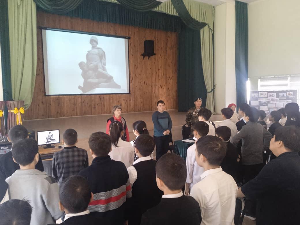 On February 3, 2023, an extra-curricular event for 6th grade students dedicated to the 80th anniversary of the Victory in the Battle of Stalingrad was held in the assembly hall, an information stand was designed. Representatives of MTU No. 12 of the First May district were invited: Deputy Chairman of the Council of Veterans Shchervovskikh O.F., participant in the military events in Afghanistan and Batken Iizbekov M., Chairman of the Organizing Committee Teltsov Evgeny Nikolaevich. All the guests spoke to the students. Shchervovskikh Olga Fedorovna touched upon the events of the Battle of Stalingrad. After that, the guys watched a documentary. Vice-principal for educational work Kupavtseva L.N. showed a presentation and spoke about the Kyrgyz heroes who participated in the Battle of Stalingrad. At the end of the event, the song “Let’s Bow to Those Great Years” was played with video fragments about the Second World War. The guests thanked for the warm welcome and the event.