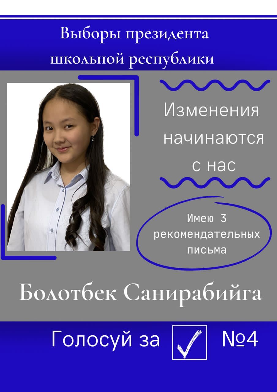 Bolotbek Sanirabiiga, a candidate for the position of the President of the School Student Government, received 134 votes, which is 14.7% of the number of voters who took part in the elections.