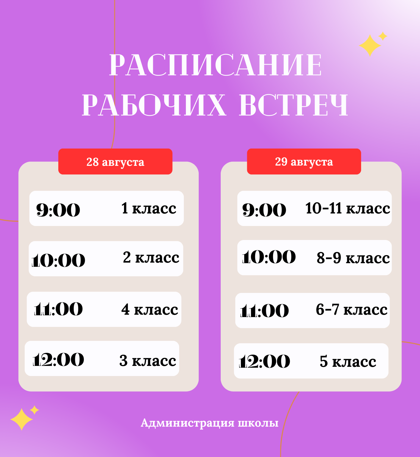 We invite you to a working meeting We remind you that working meetings of parents, students and teachers will be held on August 28-29, 2023. Поделиться Комментарии Комментариев не найдено. Новый комментарий