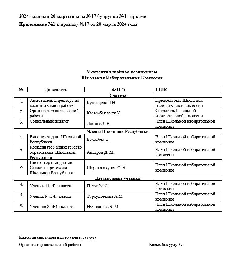 Бүгүн А.Токомбаев атындагы №24 мектеп-гимназиясынын директорунун тарбия иштери боюнча орун басарынын иш кеңсесинде мектеп президентин шайлоонун алдында Мектептин шайлоо комиссиясынын (МШК) штабын түзүлдү Бул органды чакыруу менен мектеп жетекчилиги көз карандысыздык жана калыстык принциптерине негизделген ачык-айкын жана адилет системаны түзүүгө умтулат.