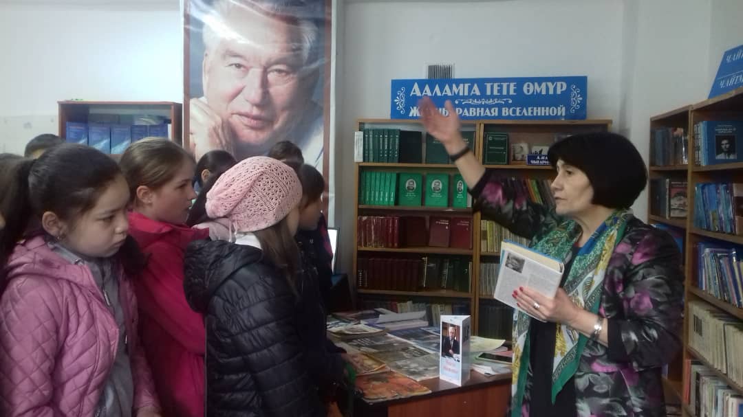 В школе есть традиция- приобщать и приближать школьников к творчеству великого писателя Ч.Т. Айтматова. И приобщение это начинается со знакомства и посещения библиотеки №1 им. Ч. Айтматова. Мы, учителя школы гимназии, с большой ответственностью относимся к передаче айтматовского духовного завещания молодому поколению, формированию в молодежи нравственных общечеловеческих ценностей. В библиотеке им. Ч. Айтматова представлены ценные экспонаты и книги, и рукописи великого писателя, и ученики школы гимназии с огромным интересом и воодушевлением знакомятся с творчеством выдающегося философа, мыслителя и общественного деятеля. Неделя прошла на славу!