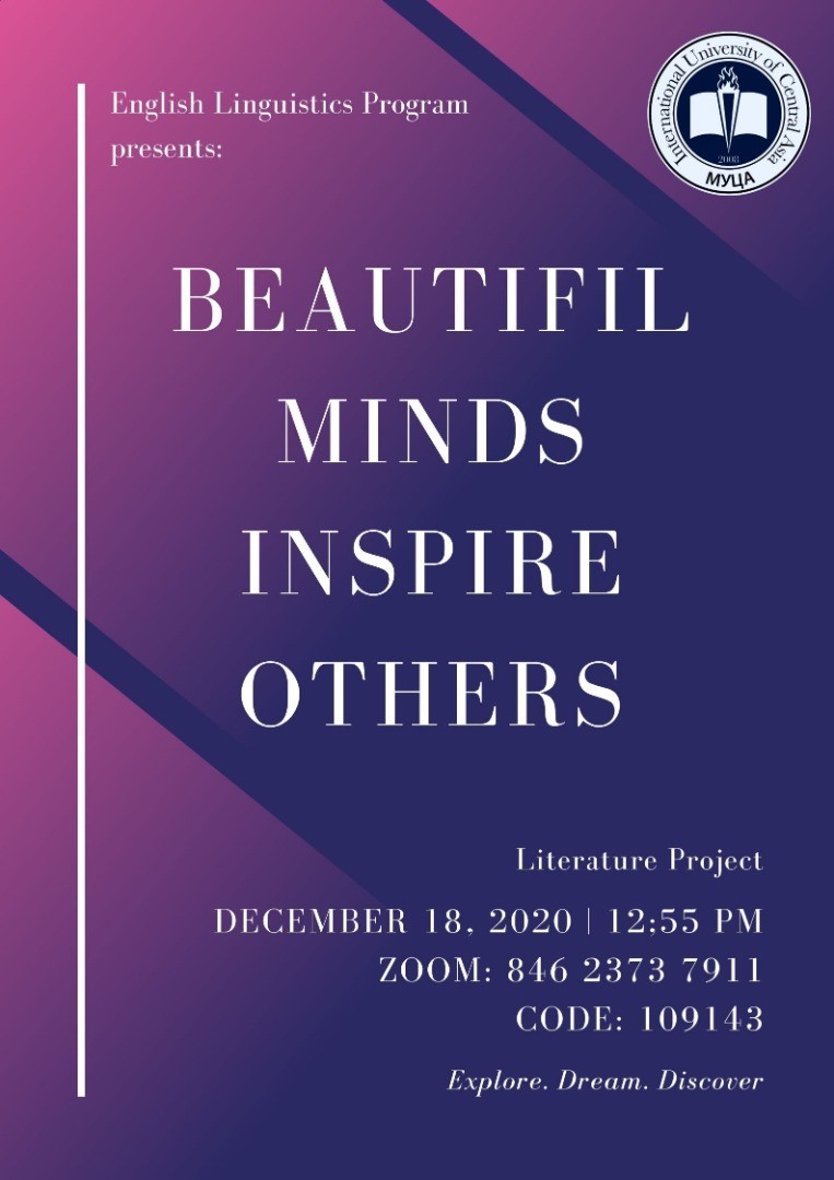 18 декабря у учащихся 10-11 классов нашей гимназии была прекрасная возможность стать участниками литературного вечера: «Красивые мысли вдохновляют других» организованный студентами Международного Университета в Центральной Азии в онлайн формате.