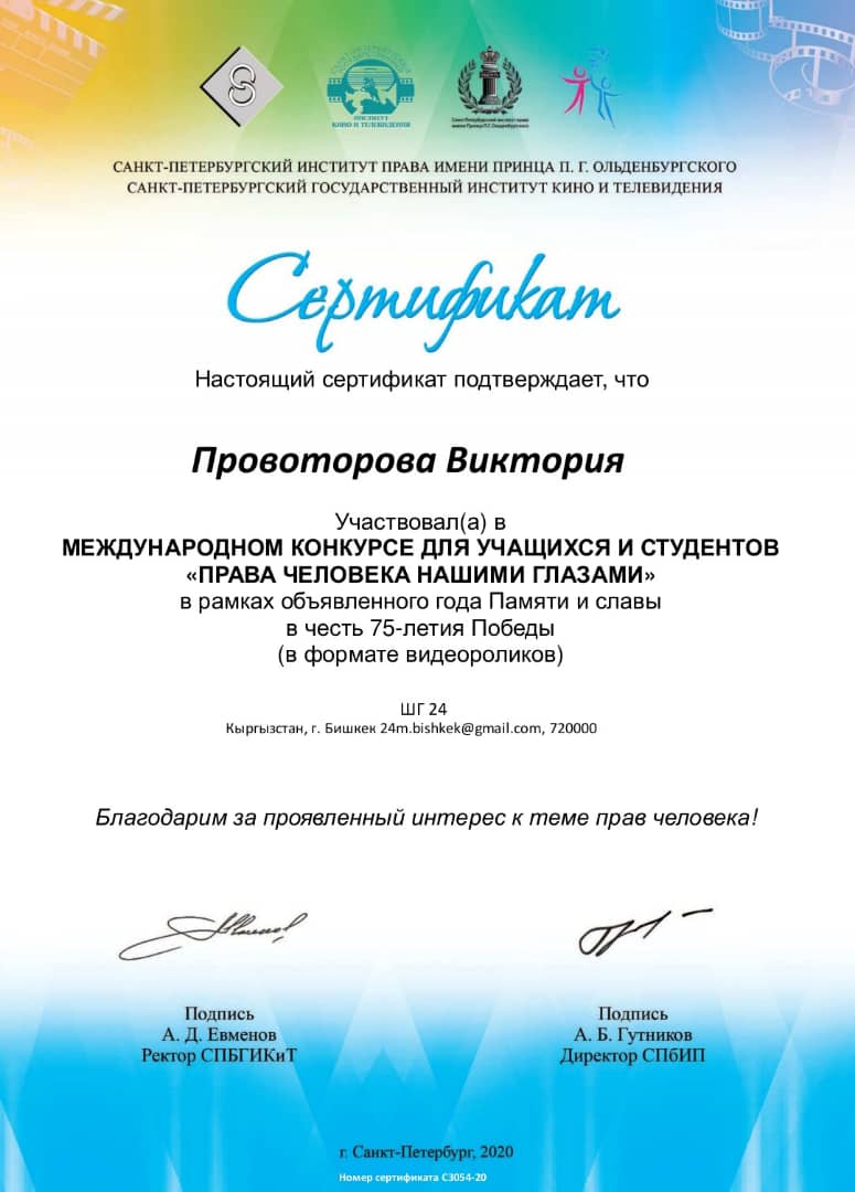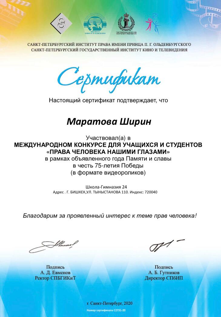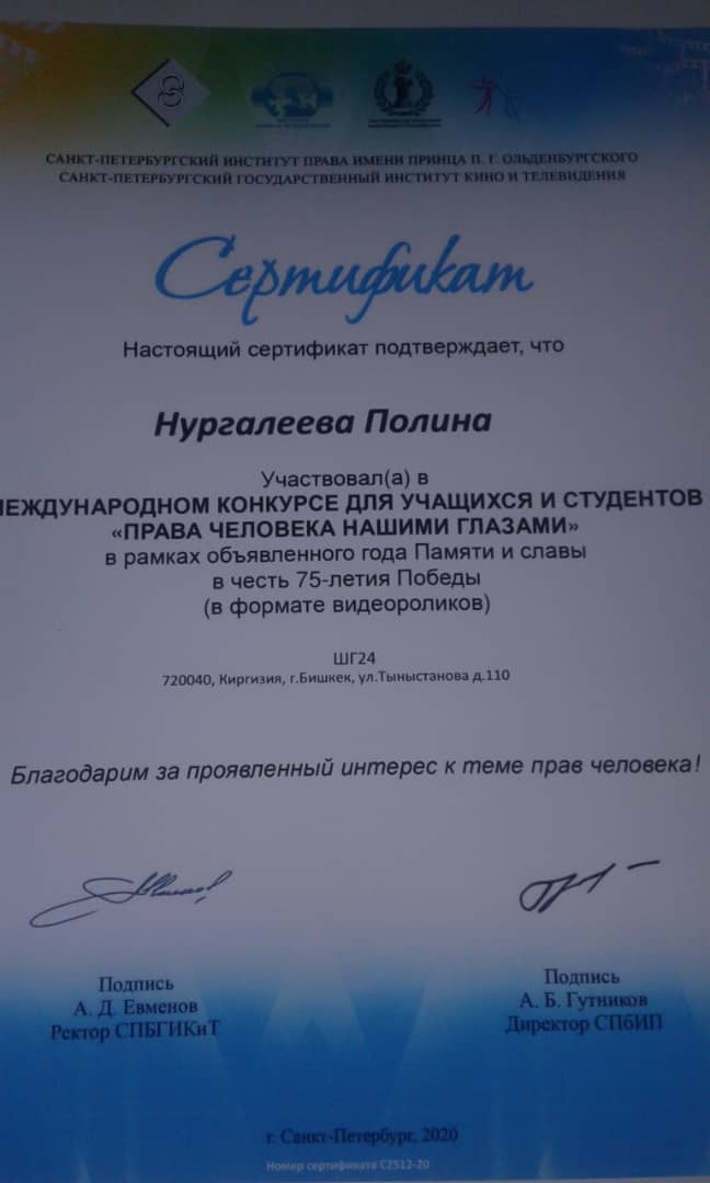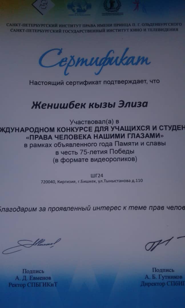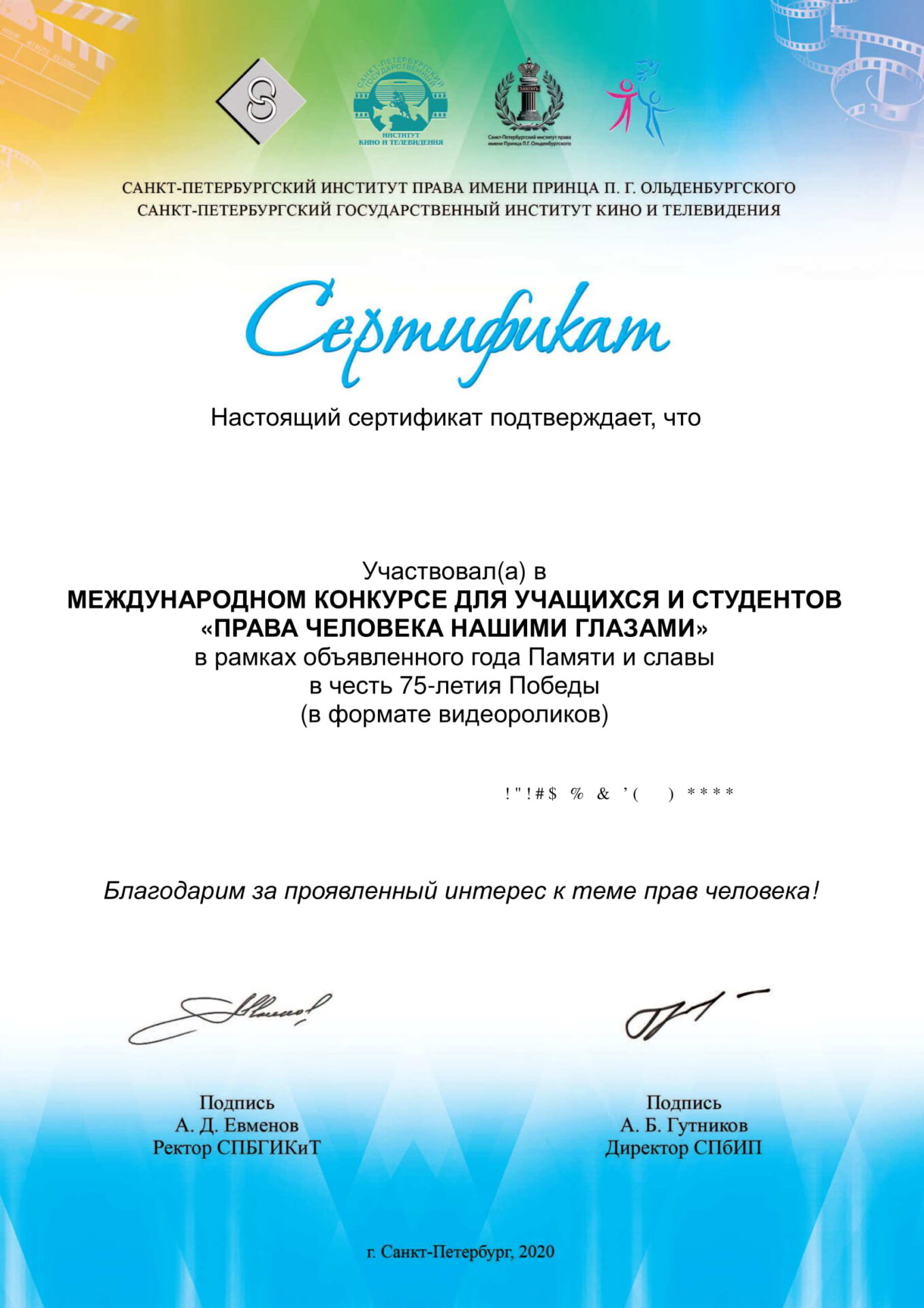 Санкт-Петербургским Государственным Институтом Кино и Телевидения, был проведен Международный конкурс видеороликов для учащихся и студентов ,,Права человека нашими глазами «, в рамках объявленного года Памяти 75 — летия Победы, в котором приняли активное участие учащиеся 9в, 10 д, 10 г, 10 а классов и были награждены сертификатами международного стандарта.