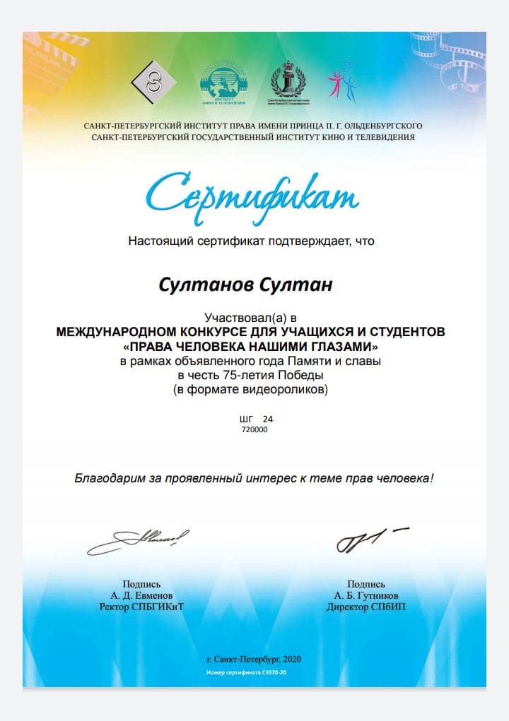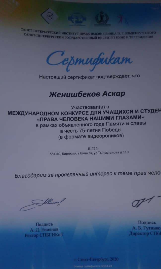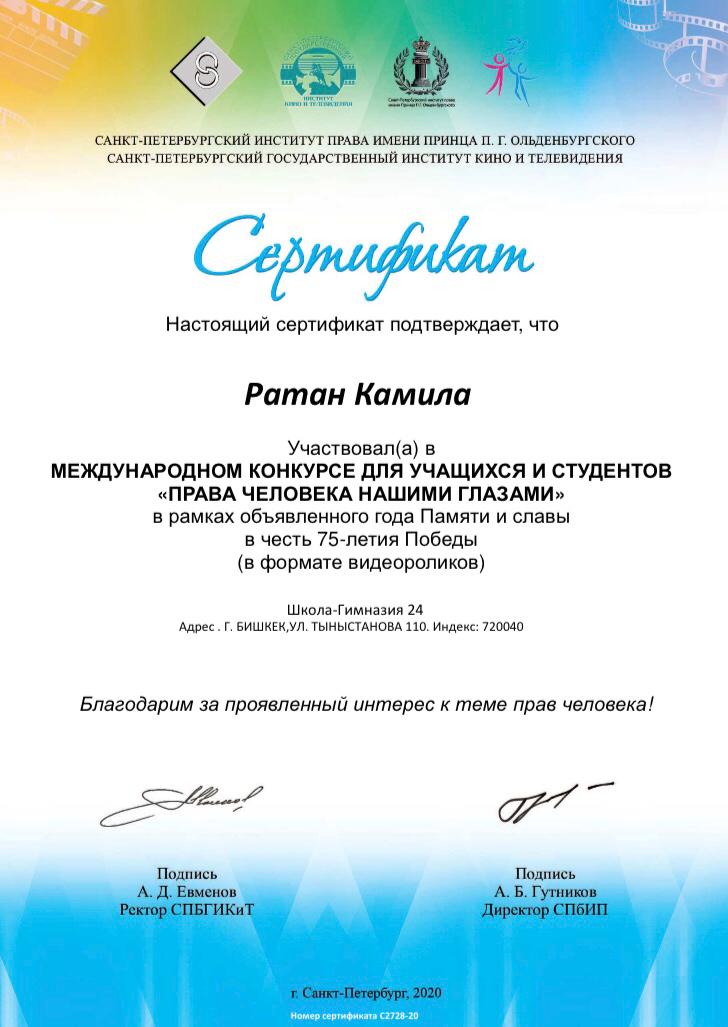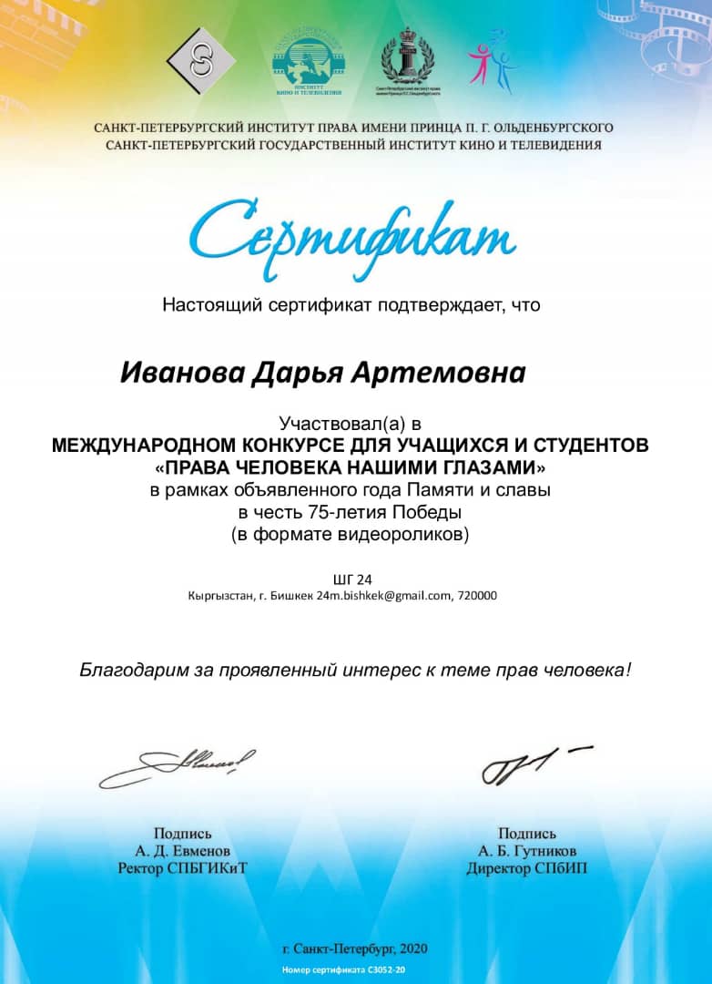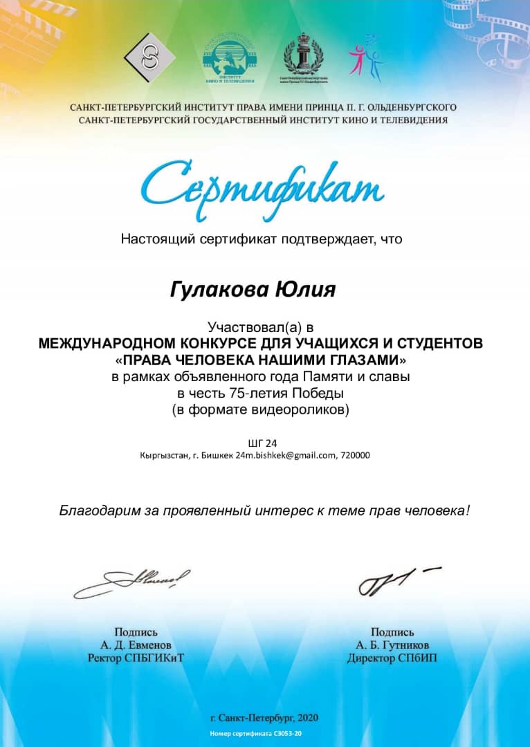 Санкт-Петербургским Государственным Институтом Кино и Телевидения, был проведен Международный конкурс видеороликов для учащихся и студентов ,,Права человека нашими глазами «, в рамках объявленного года Памяти 75 — летия Победы, в котором приняли активное участие учащиеся 9в, 10 д, 10 г, 10 а классов и были награждены сертификатами международного стандарта.