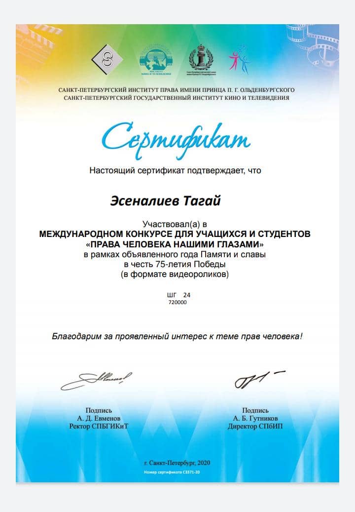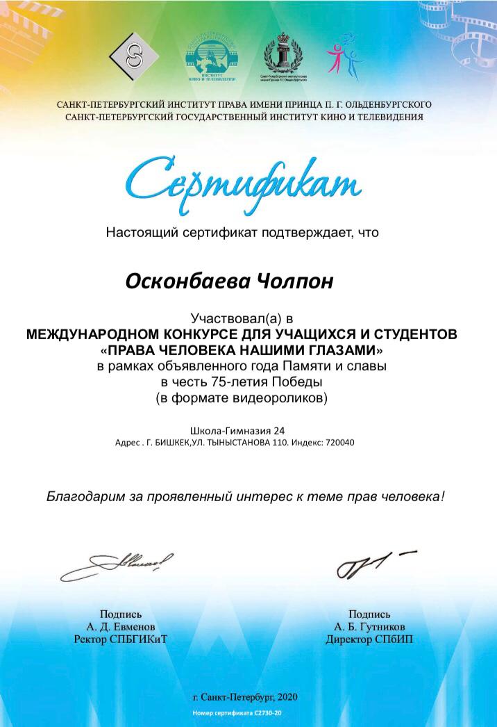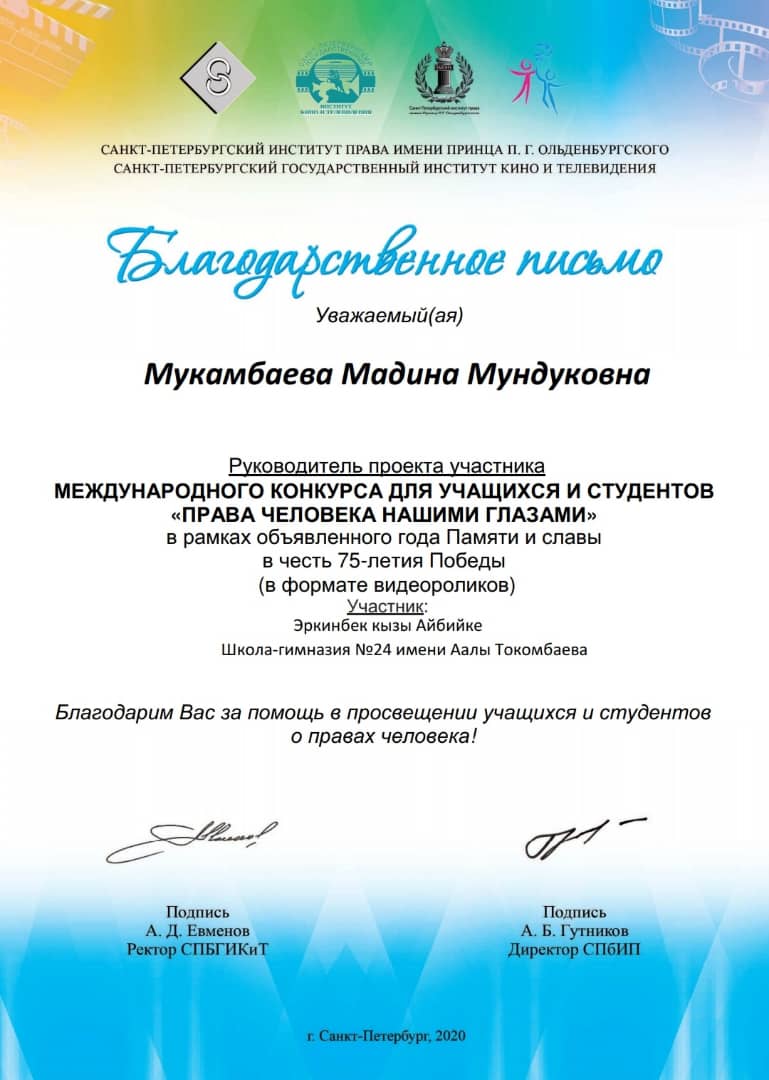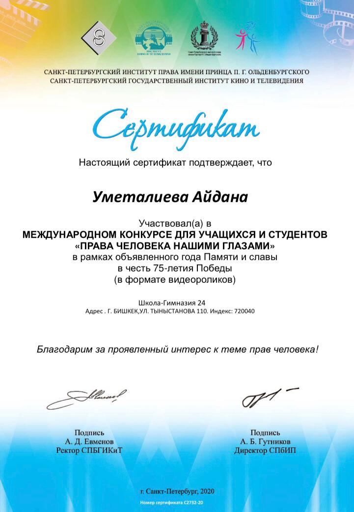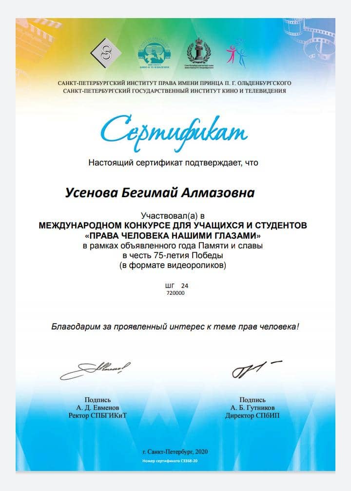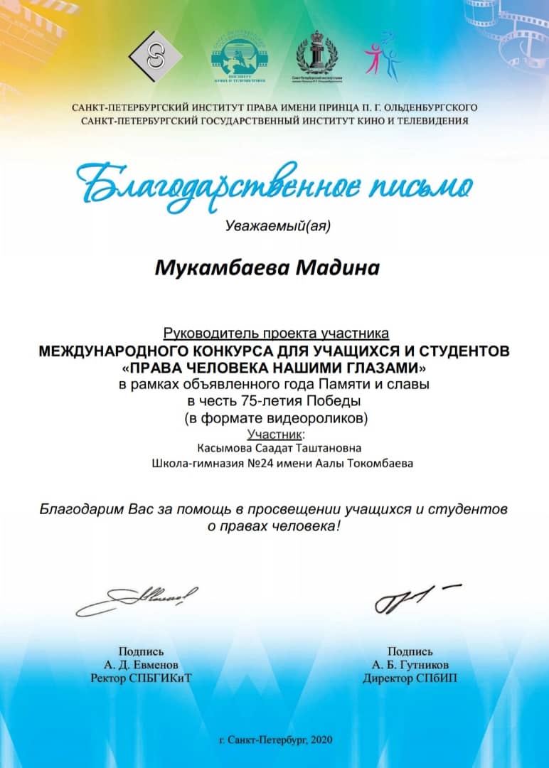 Санкт-Петербургским Государственным Институтом Кино и Телевидения, был проведен Международный конкурс видеороликов для учащихся и студентов ,,Права человека нашими глазами «, в рамках объявленного года Памяти 75 — летия Победы, в котором приняли активное участие учащиеся 9в, 10 д, 10 г, 10 а классов и были награждены сертификатами международного стандарта.