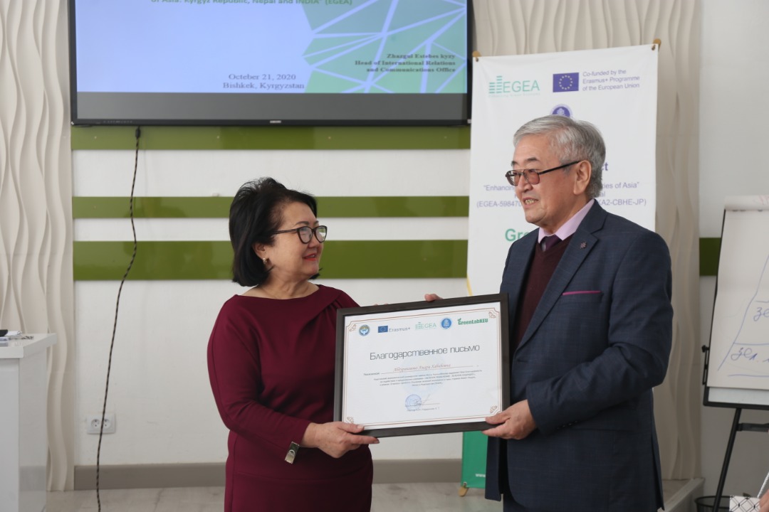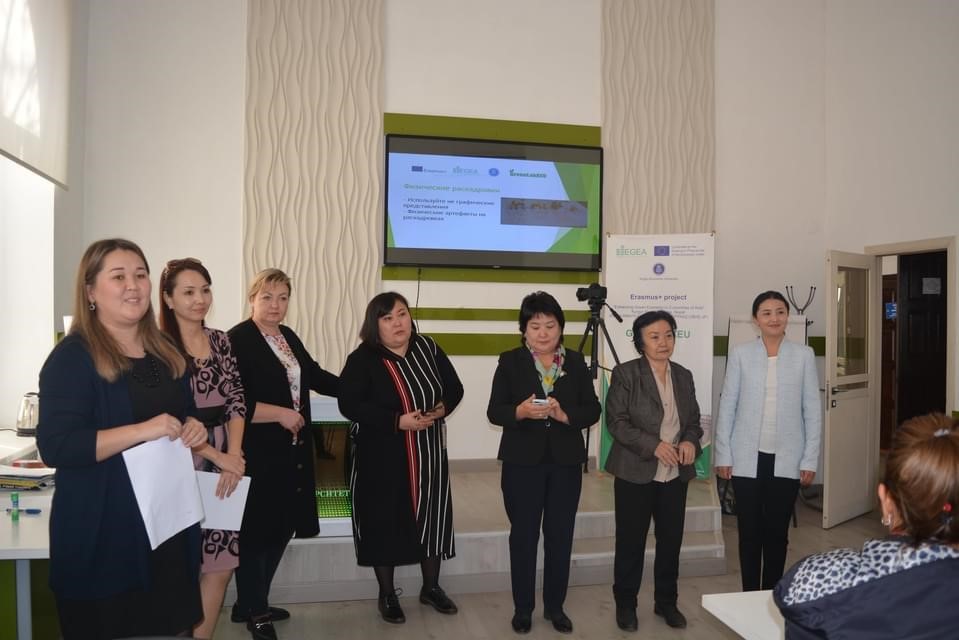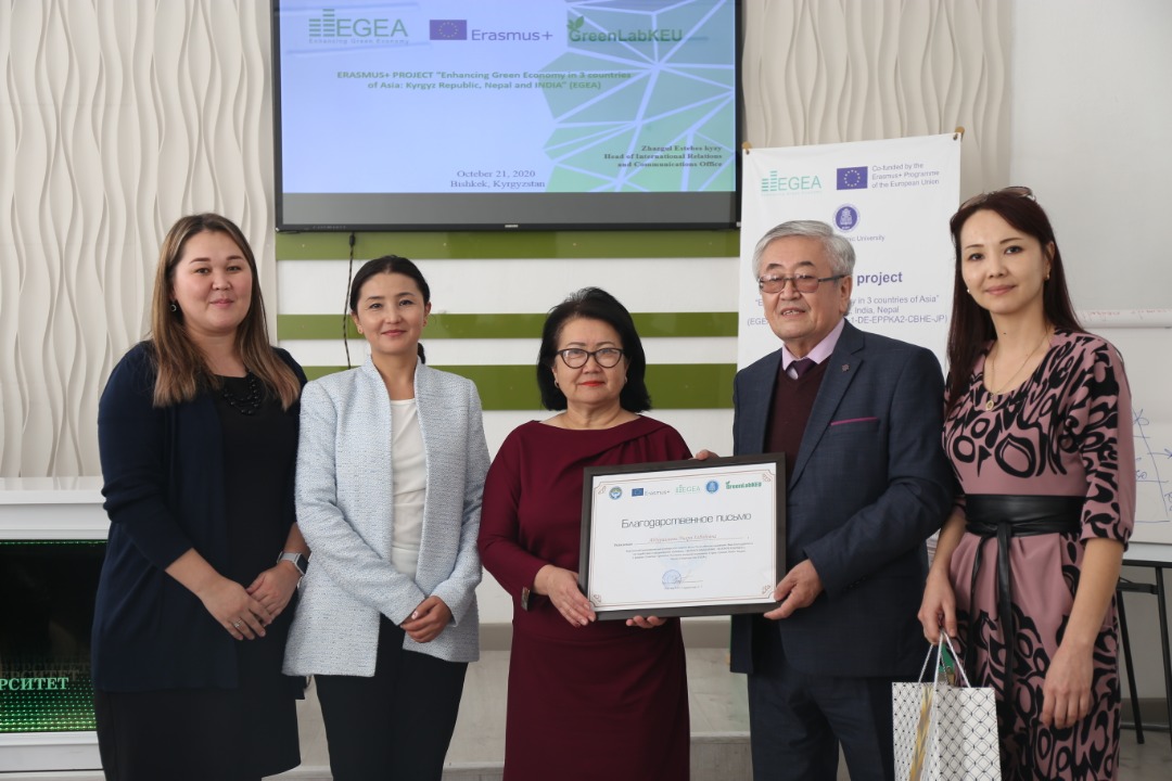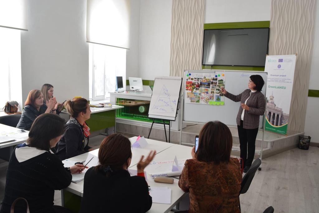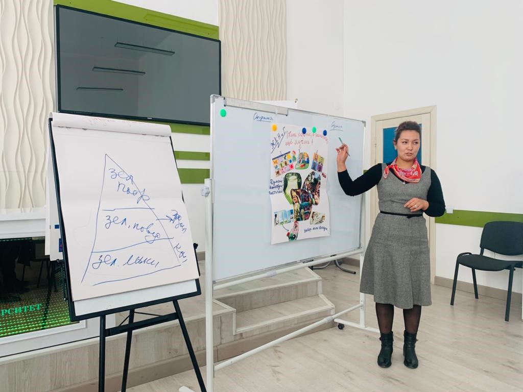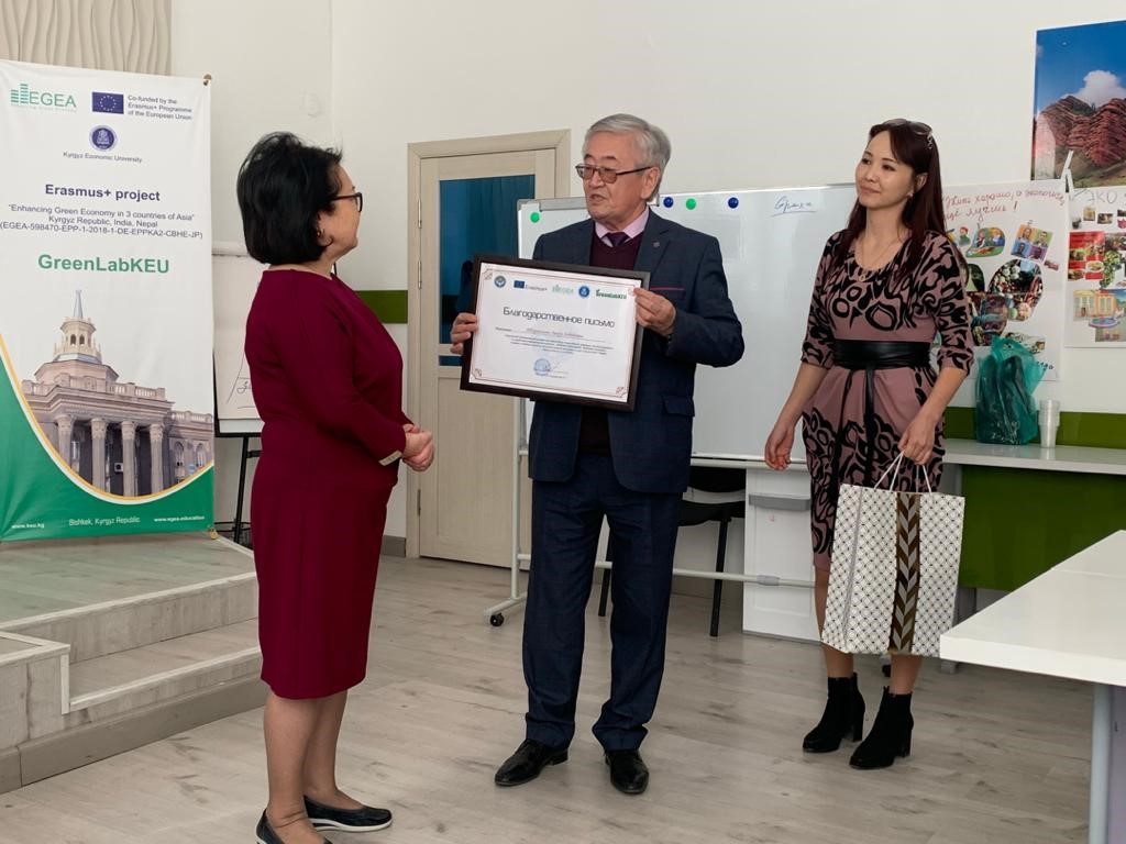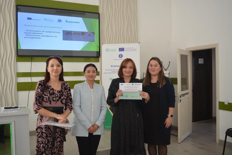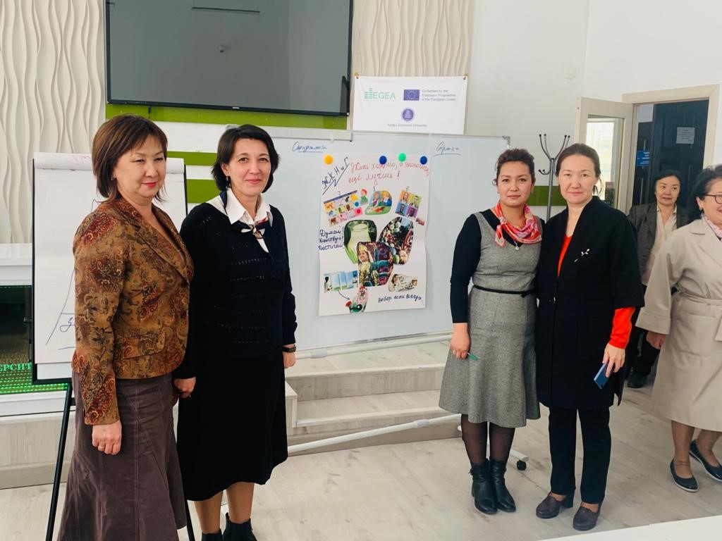 В рамках проекта «Усиление зеленой экономики в трех странах Азии» Индия, Непал и Кыргызстан (EGEA), рабочей группой проекта при поддержке администрации КЭУ был проведен тренинг «Зеленое мышление-зеленое будущее!» для учителей нашей гимназии. Организаторы тренинга разделили учителей на несколько маленьких групп которые последующем работали в соревновательном русле с применением креативных методик, где каждый участник имел возможность высказать свою точку зрения, и предложить свои уникальные идеи в реализации творческих заданий.