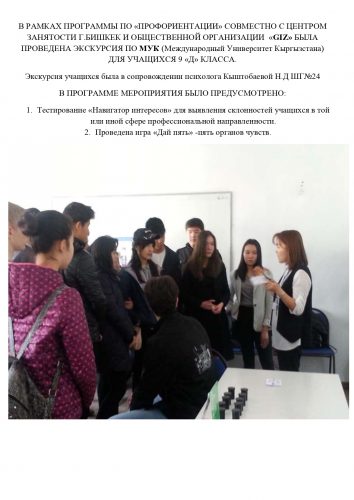 В РАМКАХ ПРОГРАММЫ ПО «ПРОФОРИЕНТАЦИИ» СОВМЕСТНО С ЦЕНТРОМ ЗАНЯТОСТИ Г.БИШКЕК И ОБЩЕСТВЕННОЙ ОРГАНИЗАЦИИ «GIZ» БЫЛА ПРОВЕДЕНА ЭКСКУРСИЯ ПО МУК (Международный Университет Кыргызстана) ДЛЯ УЧАЩИХСЯ 9 «Д» КЛАССА.