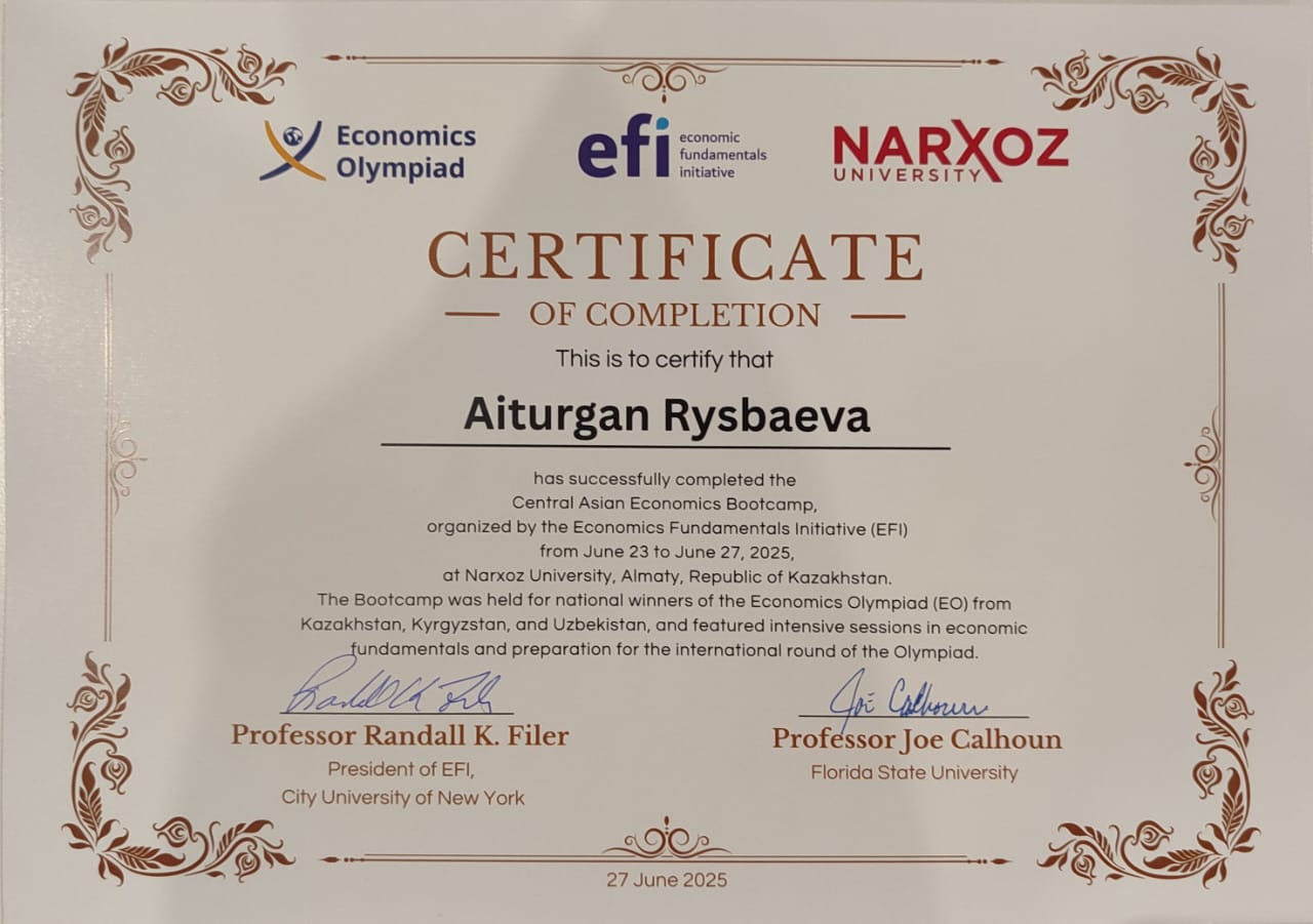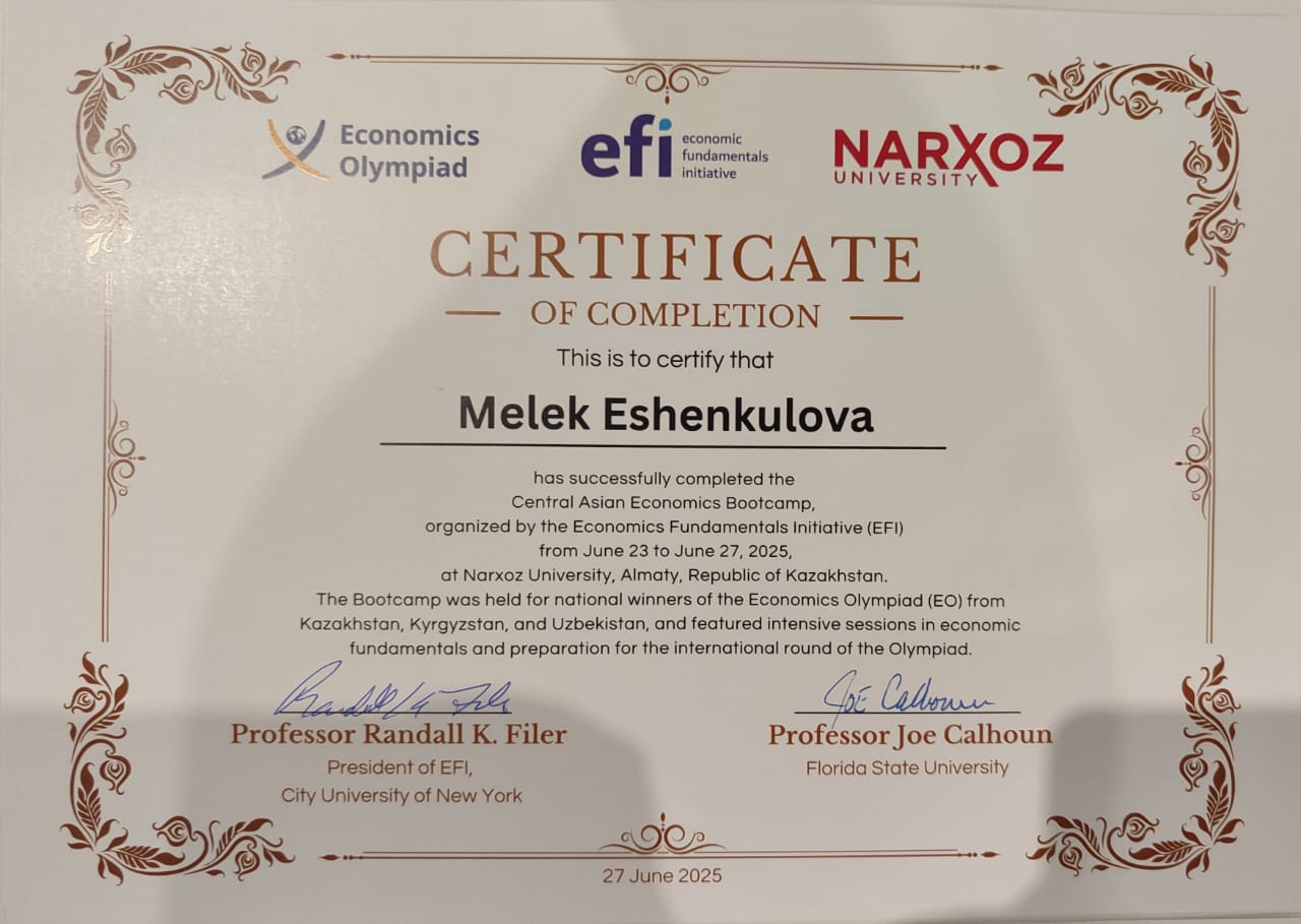 С 23 июня по 27 июня 2025 года в городе Алматы в Республике Казахстан проводилась подготовка к Олимпиаде по Экономике международному туру которая будет проводиться 5 августа 2025 года в городе Афины в Греции. В город Алматы собрались лучшие студенты республики Кыргызстан, Казахстан и Узбекистан.