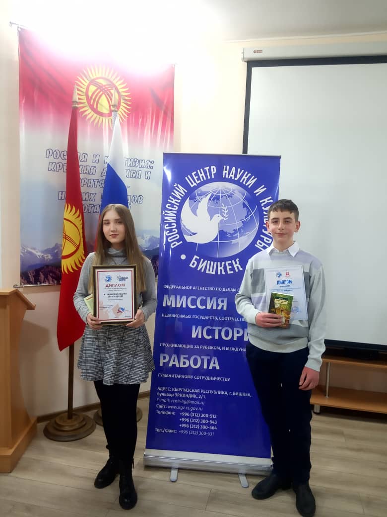 В число победителей вошло 35 юных граждан из 11 стран, в том числе Кыргызстан. От Кыргызстана победителями стали 5 человек, одна из которых ученица нашей школы Кулмашева Илария. Куратор – учитель Аттокурова Н. Т. Также победителем Республиканского тура стал учащийся нашей школы Лозовских Максим. Куратор — учитель Лозовских Л. В.