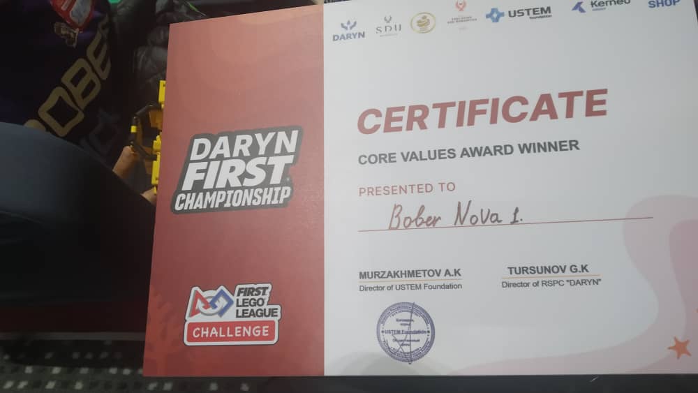 Команда робототехники ШГ 24 “Bober Nova” приняла участие в соревновании по робототехники «First Lego League Challenge Daryn», который прошел в городе Казкелен, Республики Казакстан с 7-9 января 2025 года. Соревнования прошли в здании университета «Казахский Университет SDU”. В первый день соревнований были проведены тренировочные заезды роботов, а так же основные заезды роботов. На второй день соревнований, ребята презентовали свои проекты и роботов, защищали инновационные представления и проекты. Решением судейства за два дня соревнований и по накопленным балам за прохождение роботов и лучшие инновационные проекты, команда “Bober Nova” получили квоту на финальные игры Центрально Азиатского чемпионата став одной из 8 команд ставшие победителями среди 80 групповых команд со всей Азии принимавших участие в чемпионате. Центрально Азиатский чемпионат пройдет 21-23 февраля в городе Алмата, Казахстан. Команда получила два сертификата победителей: «Rising All Stars» , «Core Value Award».